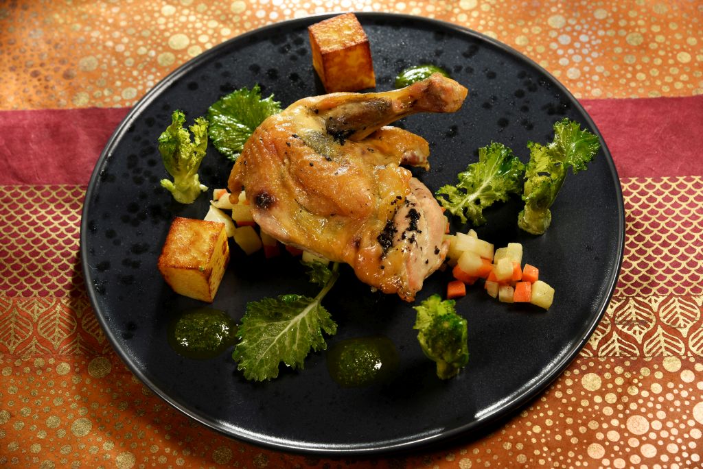 Getrüffelte Perhuhnbrust mit Crima di rapa, Wurzelgemüse und Basilikumpesto
