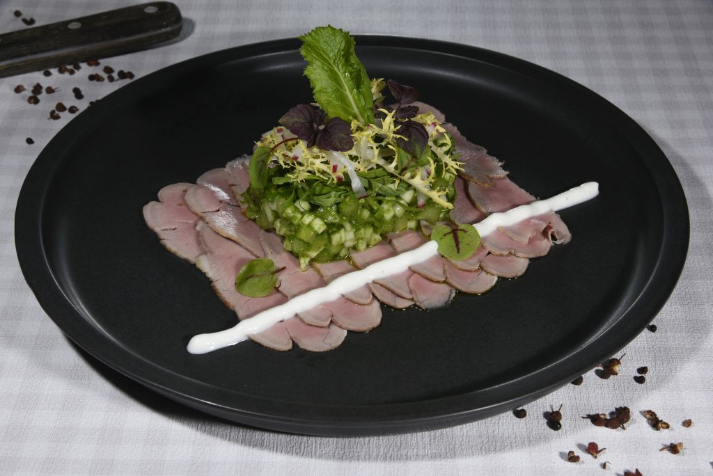 Scheiben aus dem rosa Schweinefilet mit Salat von der Mairübe und Ziegenjoghurt
