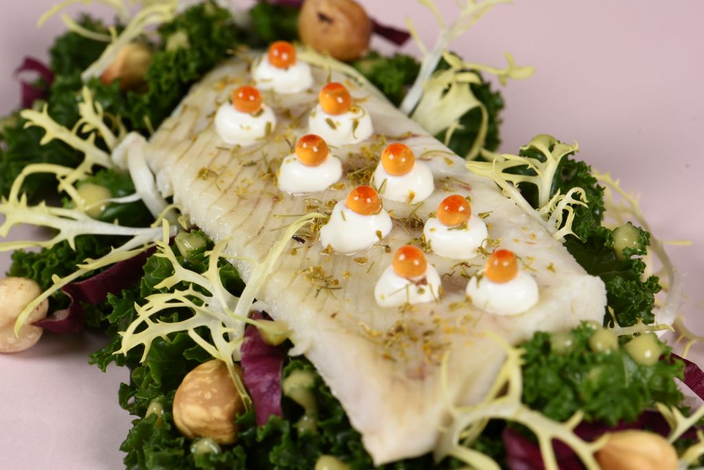 Geräucherte Regenbogenforelle mit Grünkohlsalat, Haselnussdressing und Dillblütenjoghurt