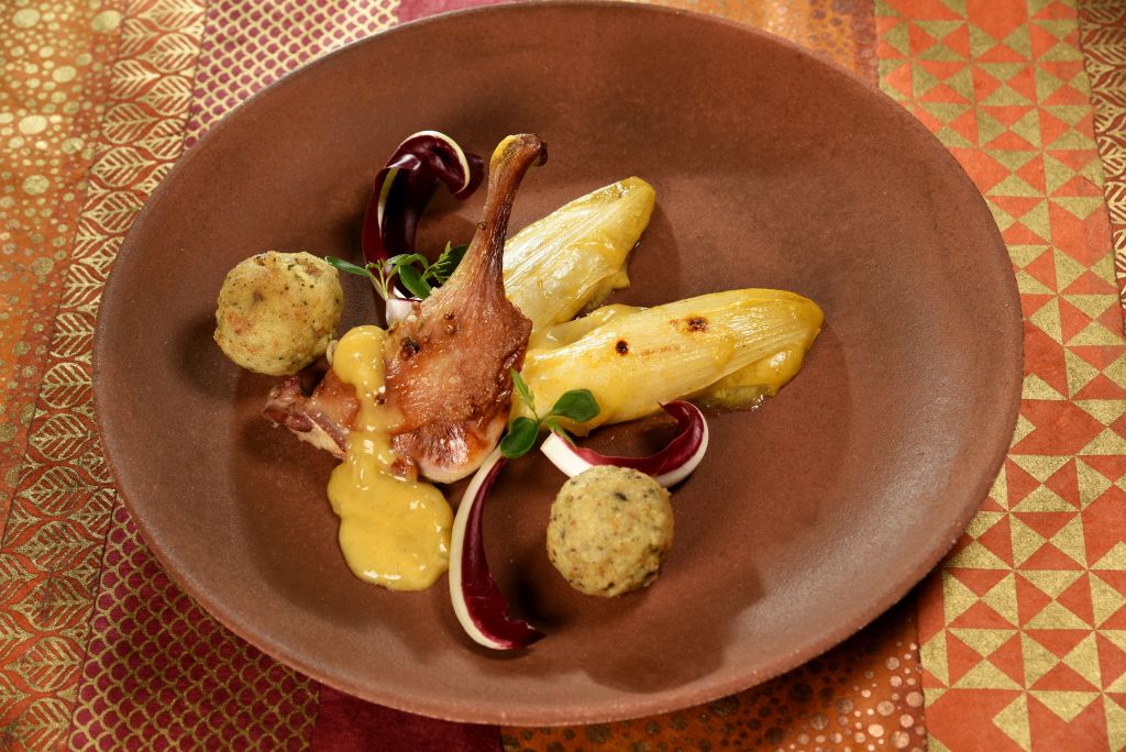 Geschmorte Wildentenkeule mit Chicorée und Kürbiskerngnocchi