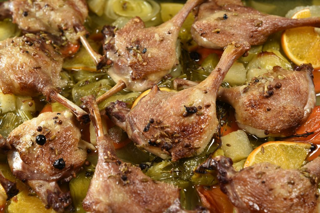 Das Wurzelgemüse, den Apfel, die Orange und die Gewürze in eine Auflaufform geben und mit Wasser auffüllen. Die Wildentenkeulen mit Olivenöl und Meersalz marinieren, auf das Gemüse setzen und die Auflaufform bei 160 Grad für 90 Minuten in den vorgeheizten Ofen geben. Alle 10 Minuten die Keulen begießen.