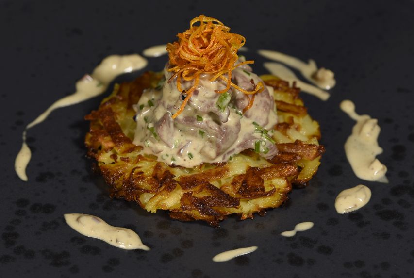 Geschnetzeltes vom schottischen Hochlandrind mit Rösti und Karottenstroh