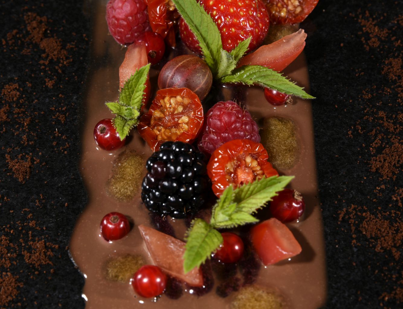 Johannisbeersaft mit Tomatensaft, Brombeerlikör und Zucker aufkochen. Mit etwas Tonkabohne aromatisieren und mit Speisestärke leicht abbinden. Die Beeren, Tomatenwürfel und kandierte Tomaten in den Fond geben, kurz erwärmen und dann kalt stellen.