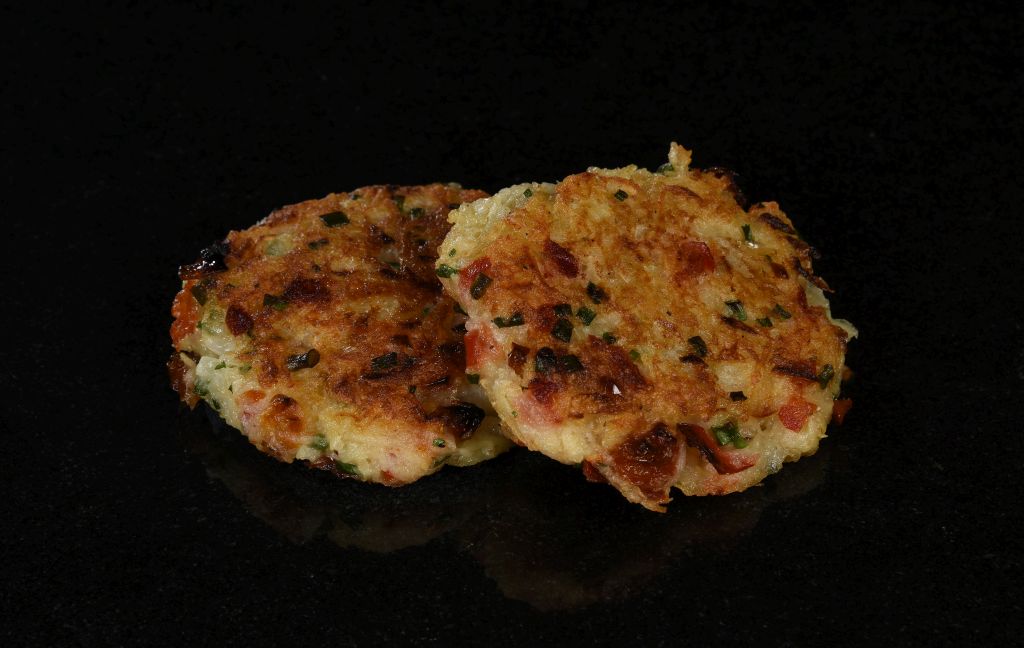 Die Kartoffeln auf einer Reibe fein reiben. Mit den Schalotten, Tomaten, Haferflocken, Schnittknoblauch und Eiern zu einem Brei vermengen. Mit Salz, Pfeffer und Muskat abschmecken. In einer Pfanne reichlich Öl erhitzen. Mit den Händen aus der Kartoffelmasse kleine Kugeln formen, diese flachdrücken und dann die kleinen Reibekuchen von beiden Seiten 5-6 Minuten goldgelb braten.