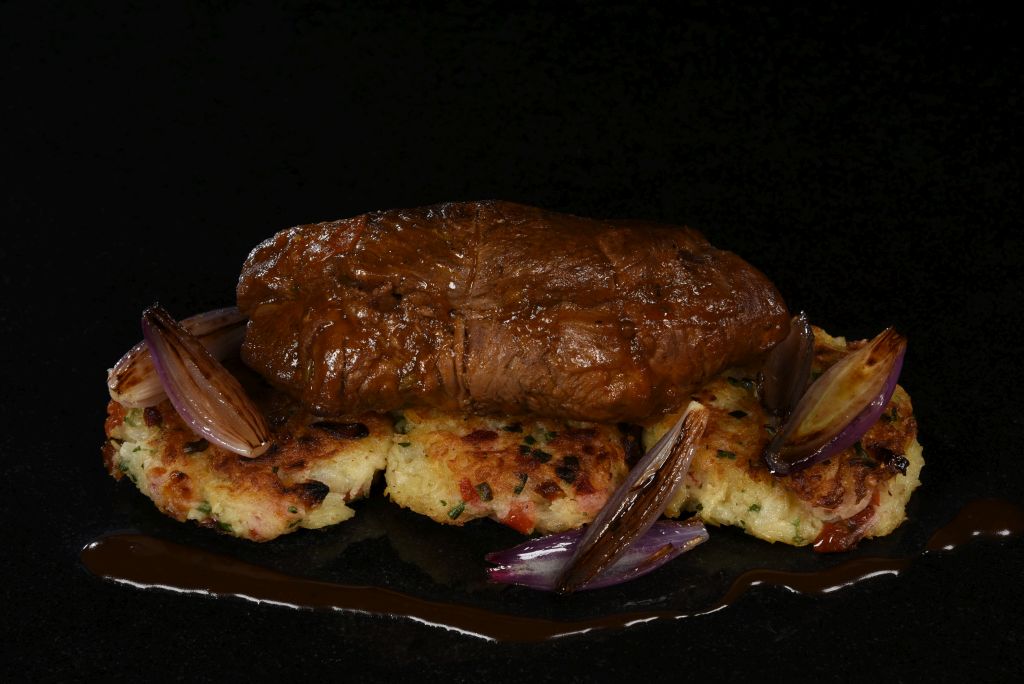 Kalbsroulade mit Tomaten-Reibekuchen und jungen Zwiebeln