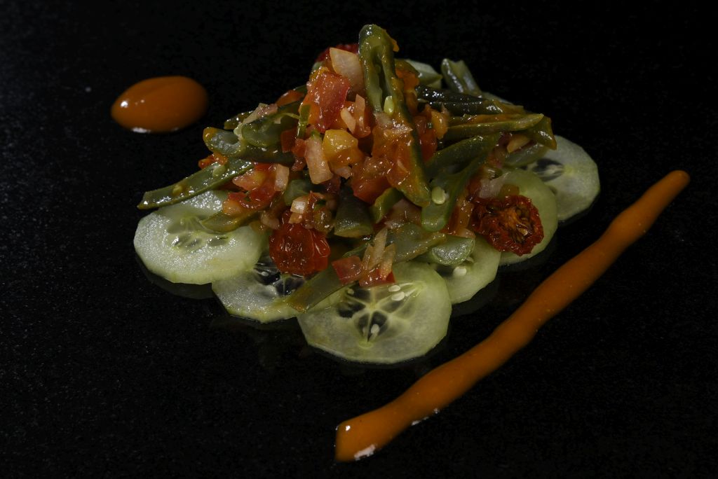 Mit den Gurkenscheiben ein Quadrat auf den Teller legen und die Gurken mit Salz und Pfeffer würzen.