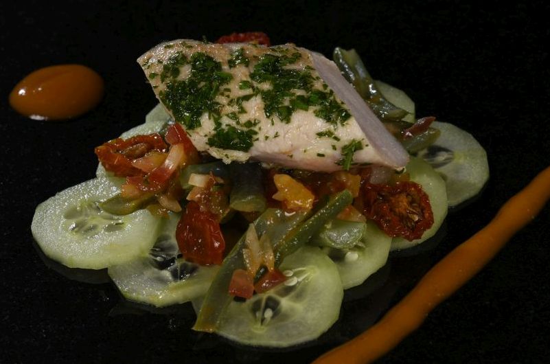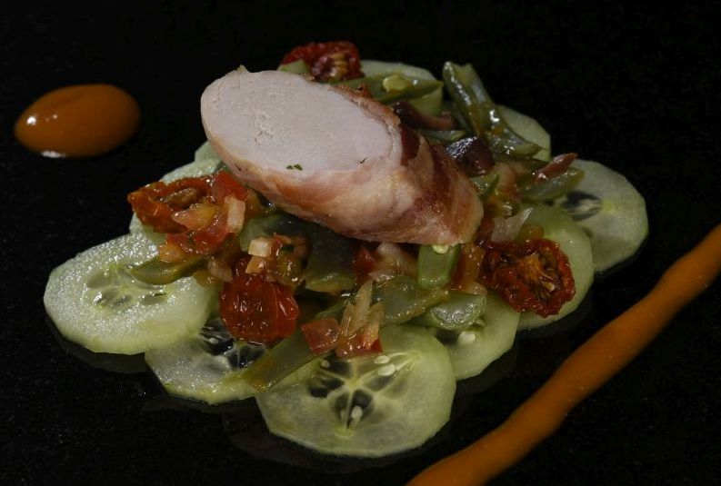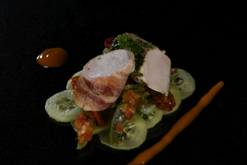 Kaninchenrücken in Gremolata und Pancetta mit Tomaten-Bohnensalat