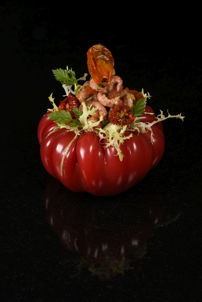 Das Fruchtfleisch der Tomate mit den Schalotten, Olivenöl, Chili, Vanille, Balsamico, Rohrzucker und Meersalz in einen Mixer geben und zu einer homogenen Vinaigrette mixen. Die Vinaigrette mit den Tomatenwürfeln und den Nordseekrabben mischen und die Fleischtomaten damit füllen. Den Cocktail mit Frisée, getrockneten Tomaten, Kerbel und Tomatenhaut dekorieren.