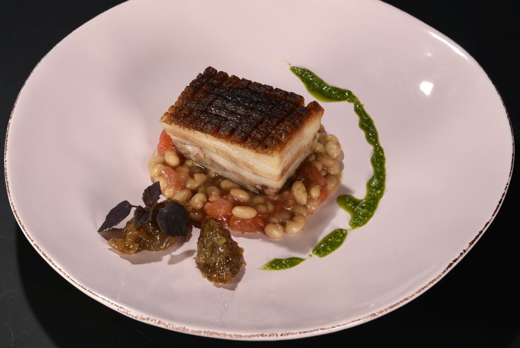 Krosser Schweinebauch mit Honig-Zwiebeln und Tomaten-Bohnenragout