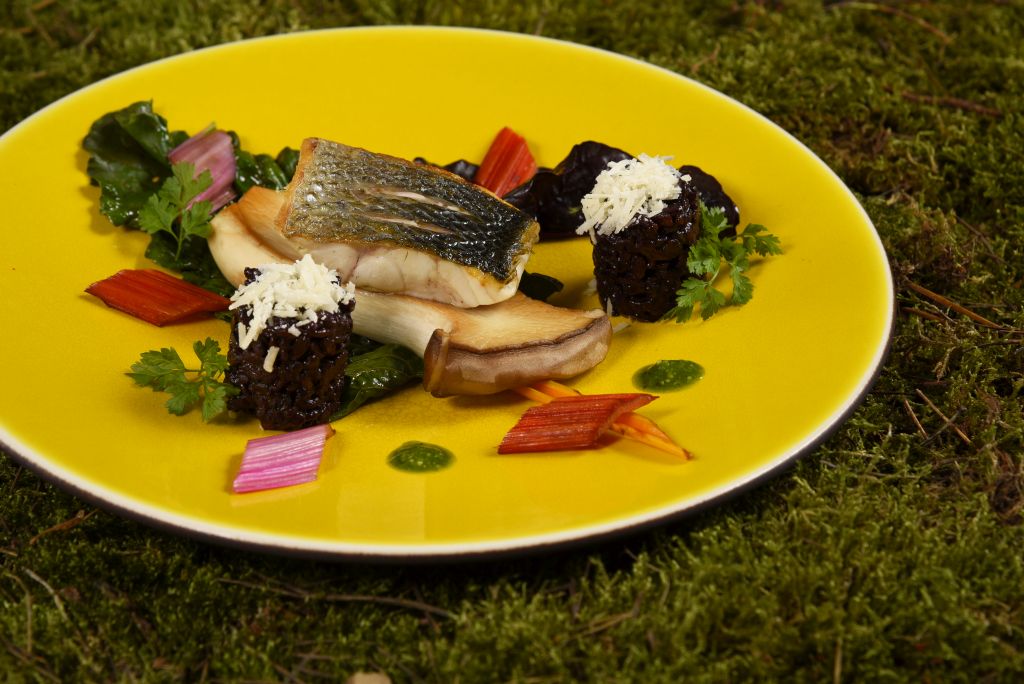 Loup de mer mit Kräuterseitling, schwarzem Risotto und Mangold