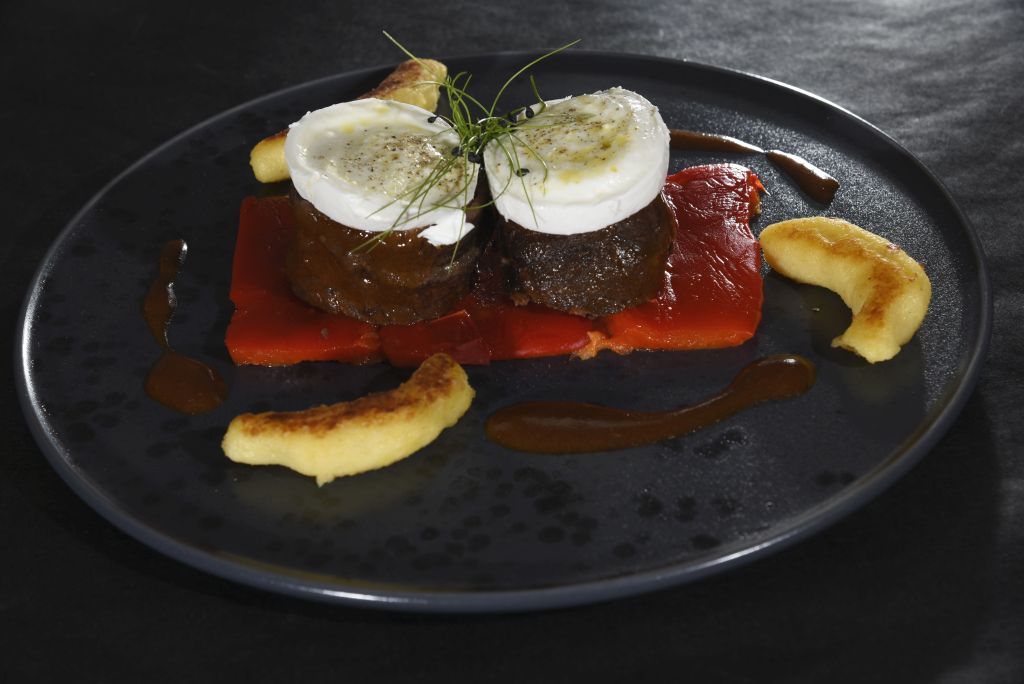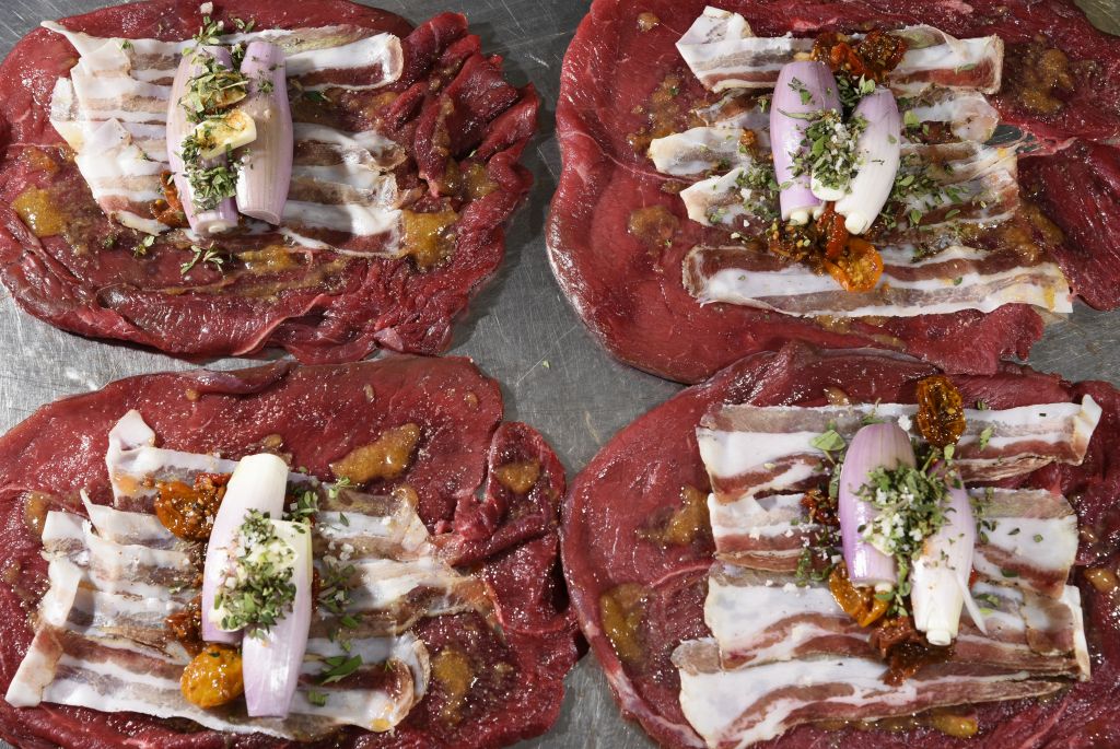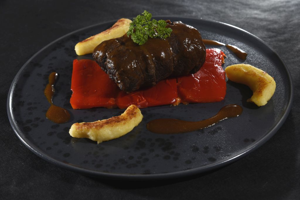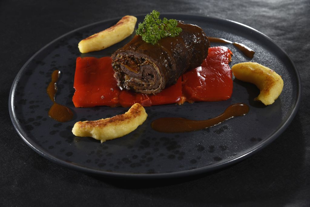 Roulade vom Wasserbüffel mit Ofenpaprika und Schupfnudeln