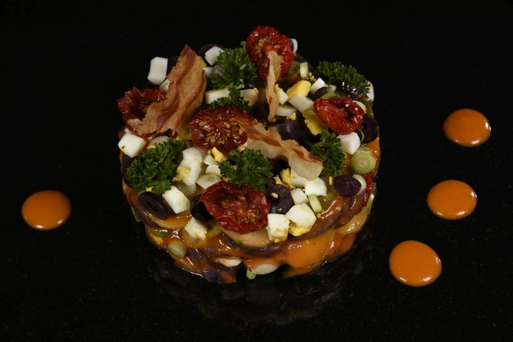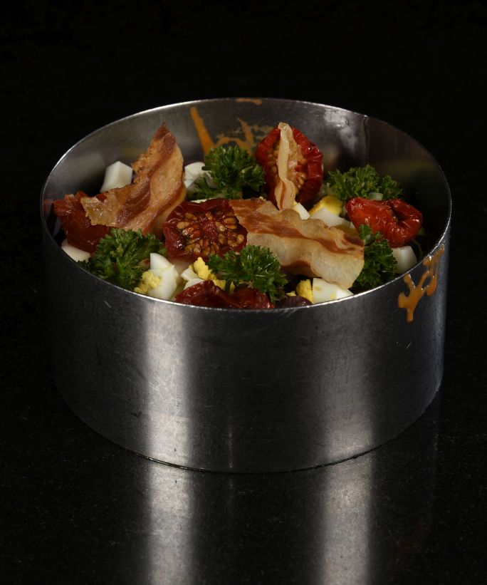 Tipp: Um dem Salat eine schöne Form zu geben, verwendet Mario einen Ring und drückt den Salat etwas an, damit er beim Abziehen vom Ring nicht sofort die Form verliert.