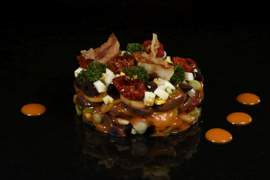 Salat von blauen Kartoffeln und Gurke in Tomatenvinaigrette