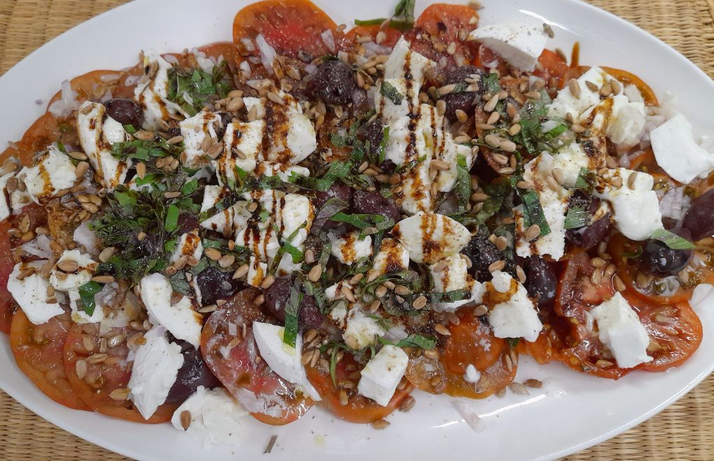 Unser Rezeptvorschlag: Tomate Mozzarella mit Oliven, Balsamico, Strauchbasilikum und gerösteten Sonnenblumenkernen
