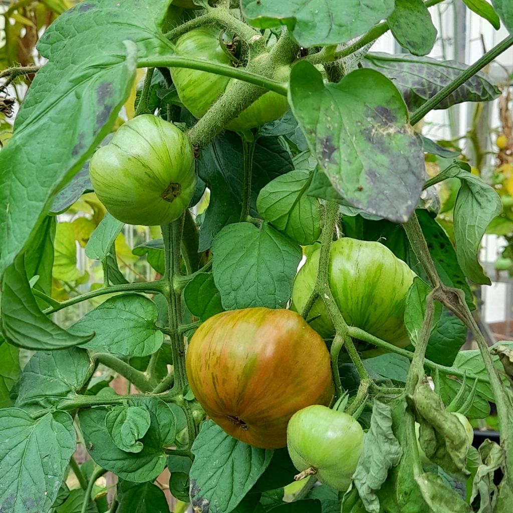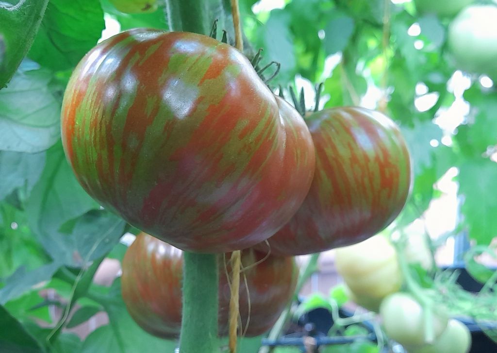 | Info: | Eine Züchtung von John Siegel, die uns absolut überzeugt hat und empfehlenswert ist. Wunderschöne Früchte, ein guter Ertrag und eine lange Saison bis Ende Oktober. Wir haben diese Sorte im Gewächshaus gezogen. Die Pflanze braucht eine gute Stütze, denn das Band zum Stabilisieren hat zum Schluss nicht gereicht und sie ist in der Mitte abgebrochen. |