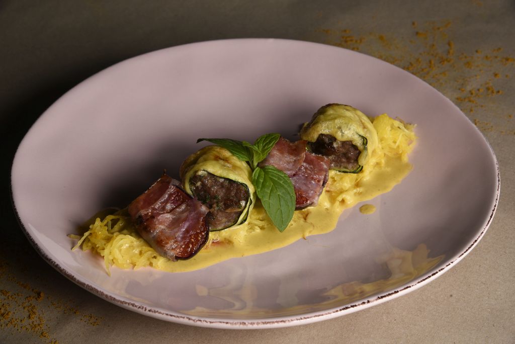 Spaghettikürbis mit Hackröllchen, Speckfeigen und Currysoße