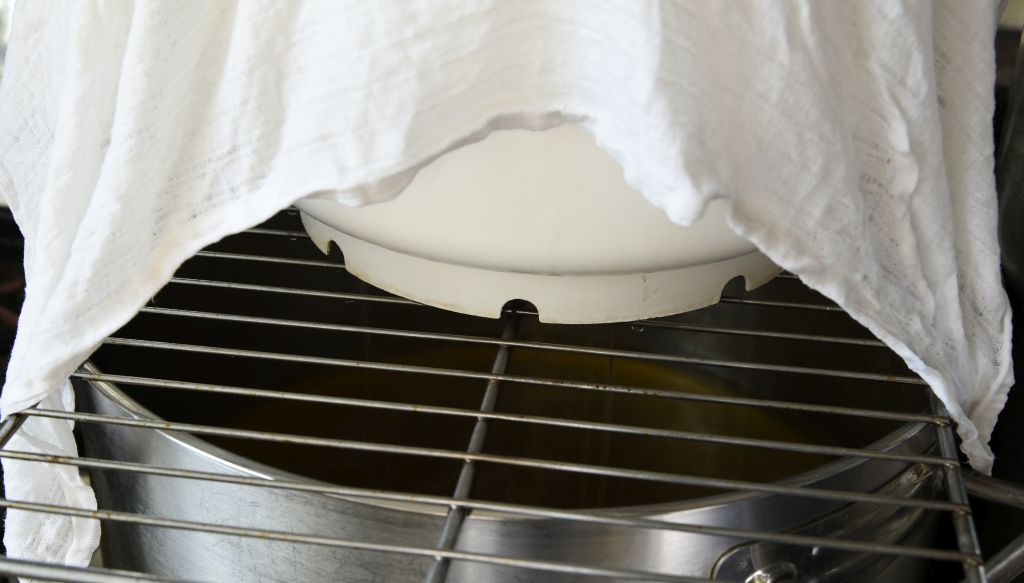 Die Suppe durch ein Sieb mit Tuch in einen Topf tropfen lassen. Sehr gut geeignet zum Passieren sind Stoff-Babywindeln. Ich lasse die Suppe sogar die ganze Nacht austropfen, so erhält man einen klaren Tomatensud und kann den kompletten Saft gewinnen.