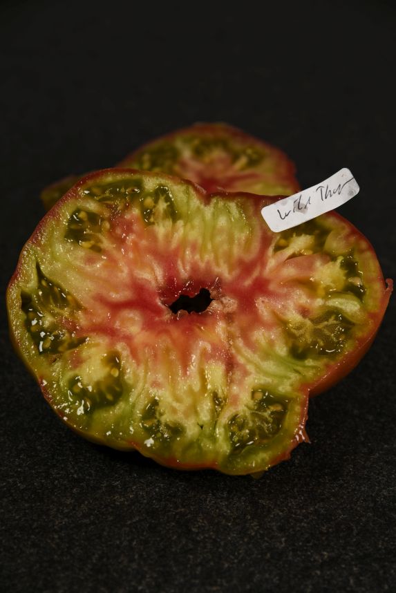 | Info: | Die großen Früchte brauchen lange zum Reifen, daher waren wir deprimiert, dass kurz vor der Ernte die Schnecken schneller waren als wir. Die reifen Früchte behalten übrigens oft grüne Schultern. Diese Züchtung stammt von Bill Jeffers, von dem wir auch schon die Sorte Cherokee Lime Stripe hatten. |